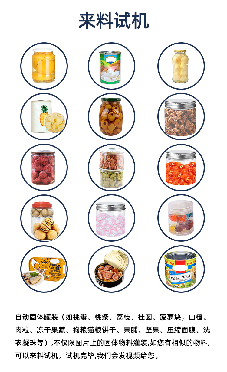 本機廣泛適用于玻璃罐、馬口鐵罐、塑料罐及廣口瓶等多種容器類型。它主要用于沙丁魚、黃桃瓣、桃條、桃丁、梨塊、梨球、山楂、草莓、葡萄、杏、荔枝、紅燒肉、雞肉等罐頭產品的自動計量與裝罐,展現出廣泛的適用性。