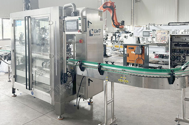 灌裝——旋蓋——稱重檢測——膜包收縮——機(jī)器人碼垛——纏繞