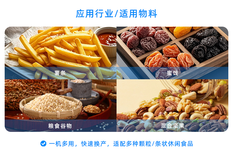 3. 一機多用,不僅適配薯條,堅果、谷物、膨化食品等顆粒物料可輕松切換,靈活應(yīng)對市場變化。